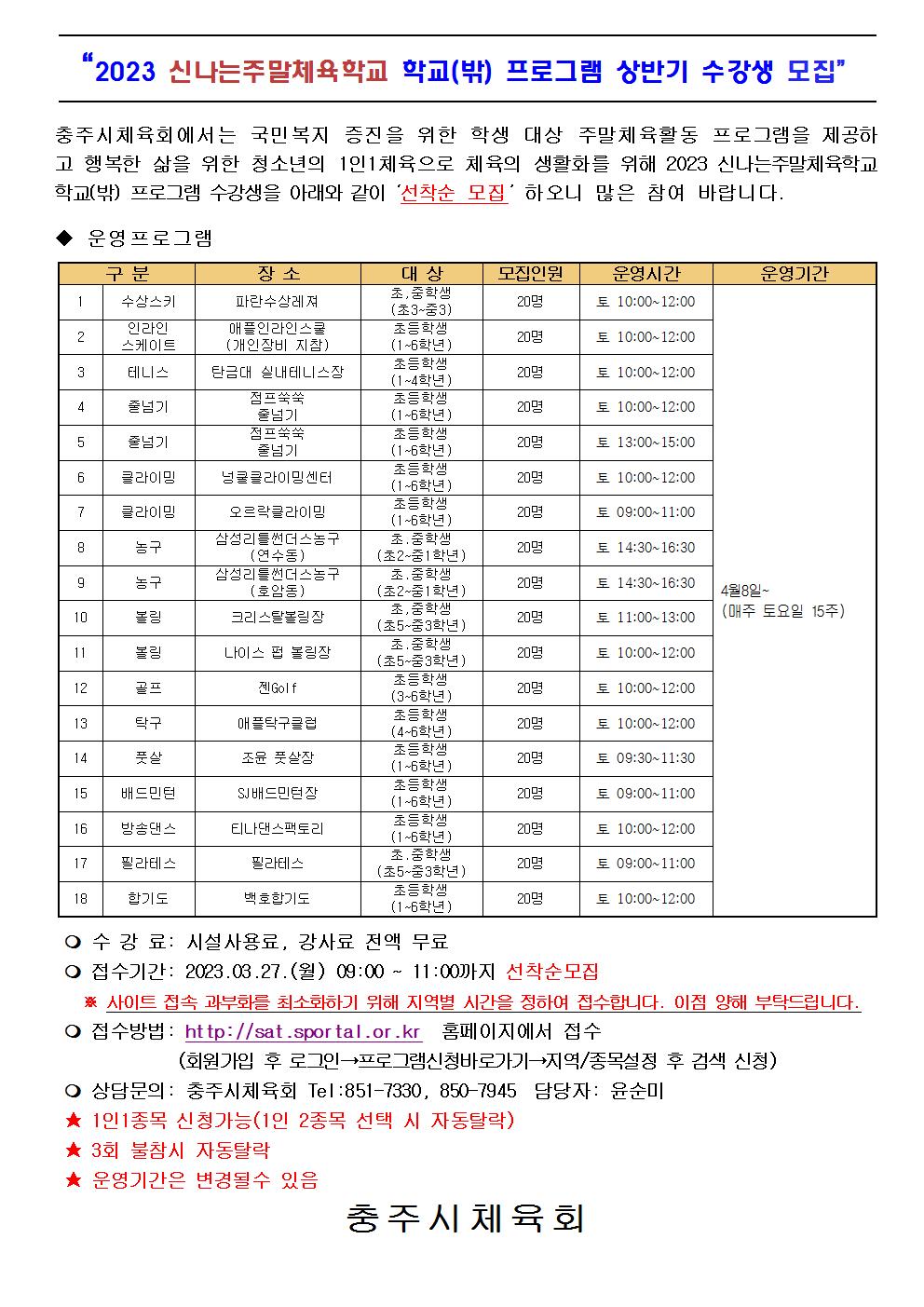 | 2023신나는주말체육학교 학교(밖)프로그램수강생모집(안) | |