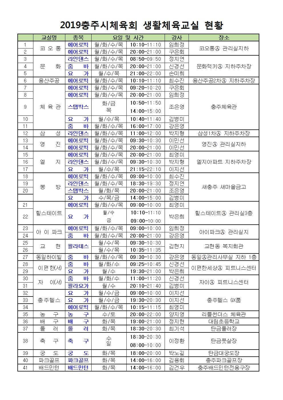 2019 충주시체육회 생활체육교실 현황 |