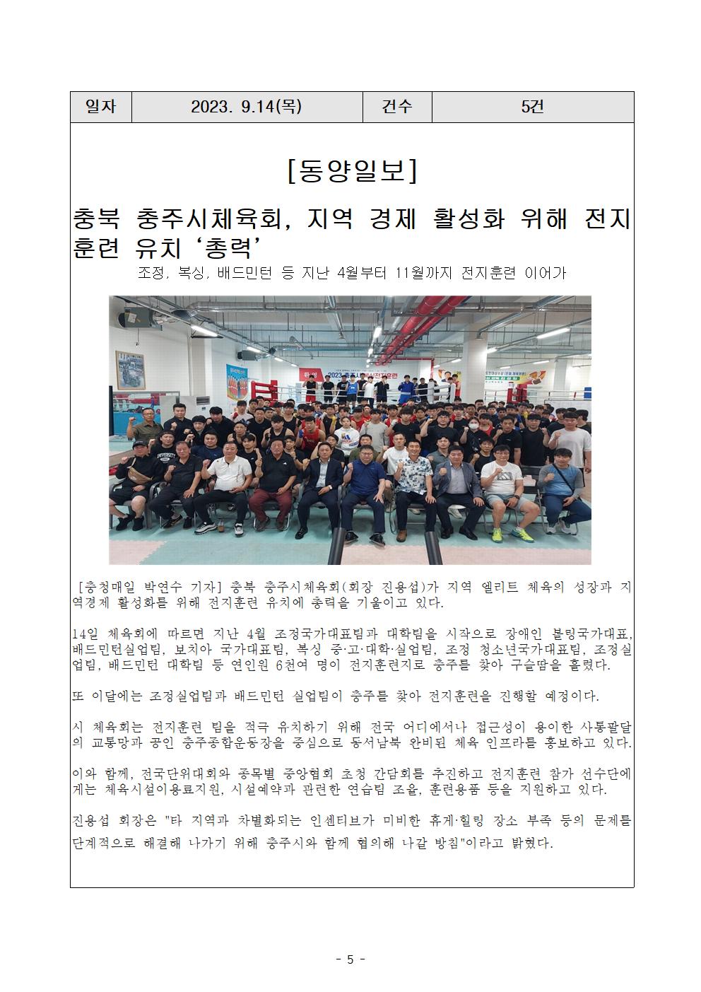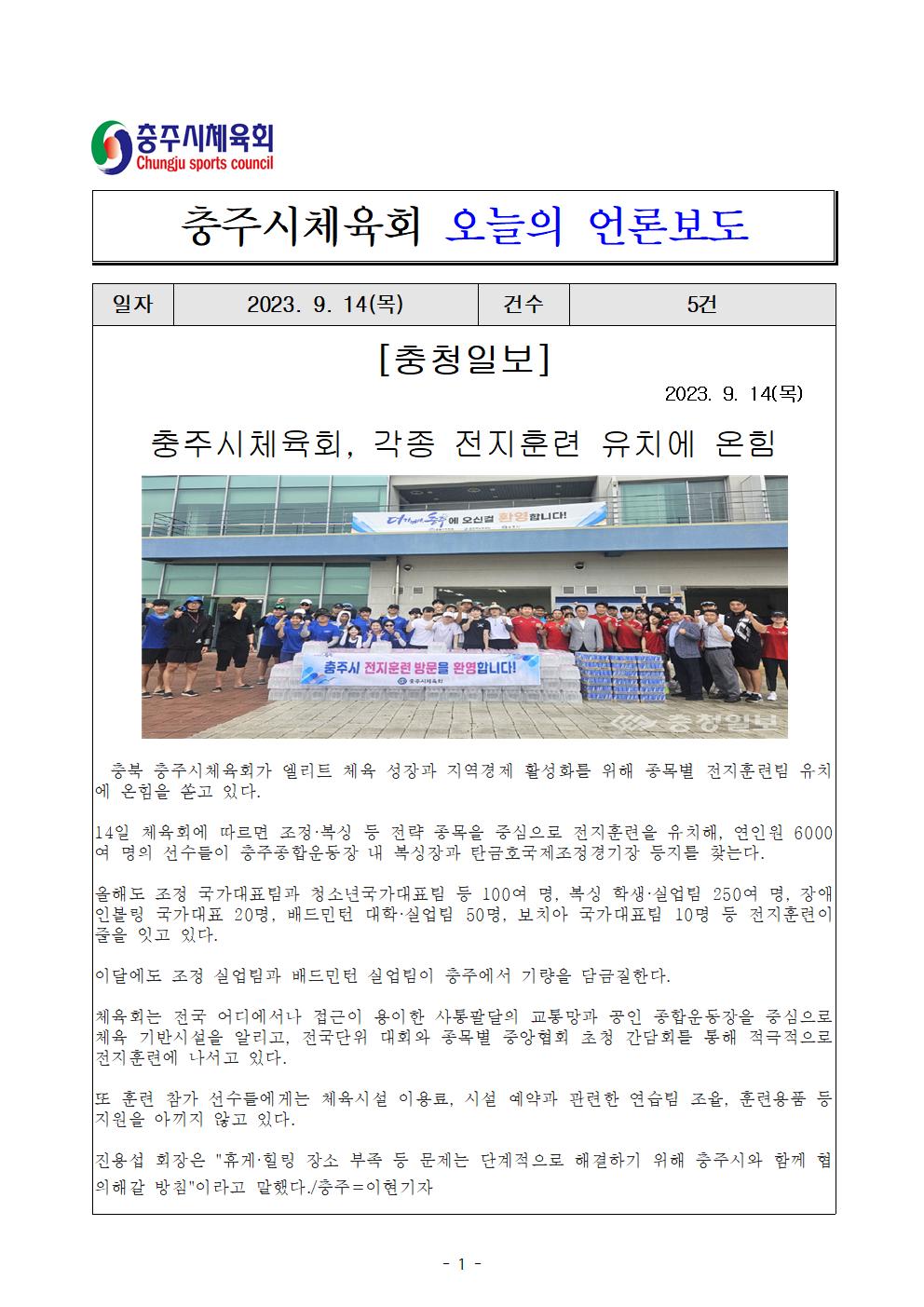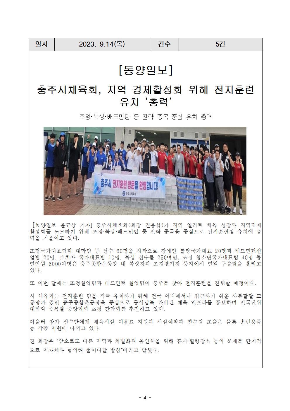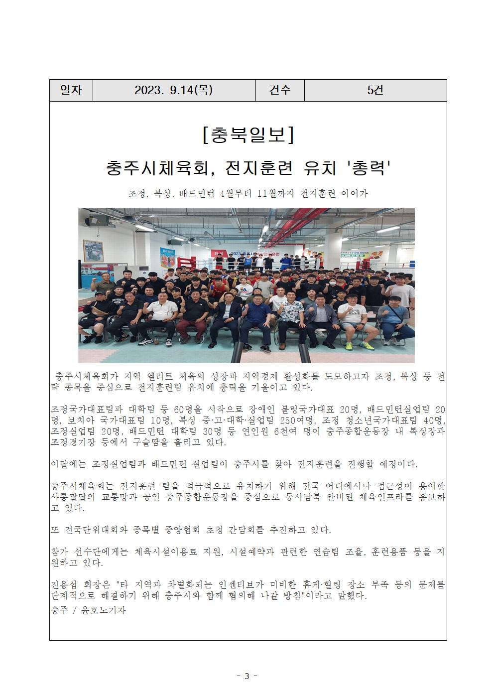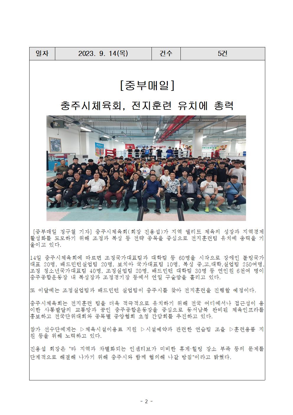 [2023 충주 전지훈련 총력] -기간 : 2023. 4월~12월 -대상 : 충주시 전지훈련 종목(장애인종목 포함) -주관 : 충주시체육회(회장 진용섭) -내용 : 전지훈련팀 격려, 지원 등(조정, 배드민턴, 복싱 등) [언론보도] -중부매일 https://cp.news.search.daum.net/p/137402066 -충북일보 https://cp.news.search.daum.net/p/137401349 -충청일보 https://cp.news.search.daum.net/p/137406248 -동양일보 https://cp.news.search.daum.net/p/137418863 -중원신문 http://www.joongwonnews.com/news/articleView.html?idxno=11168 -충청매일 https://cp.news.search.daum.net/p/137430452 |