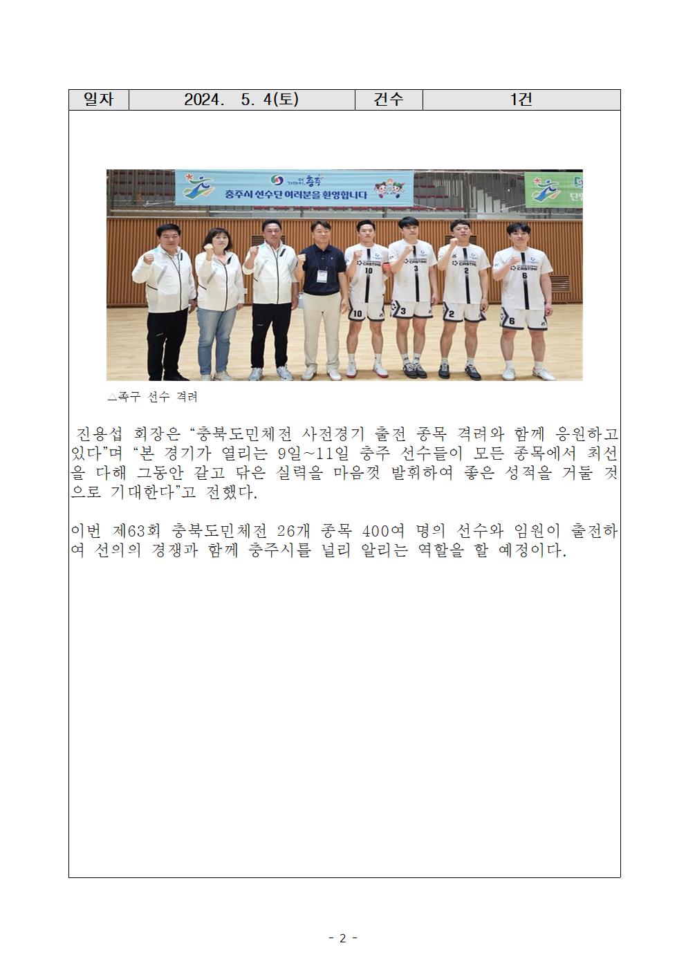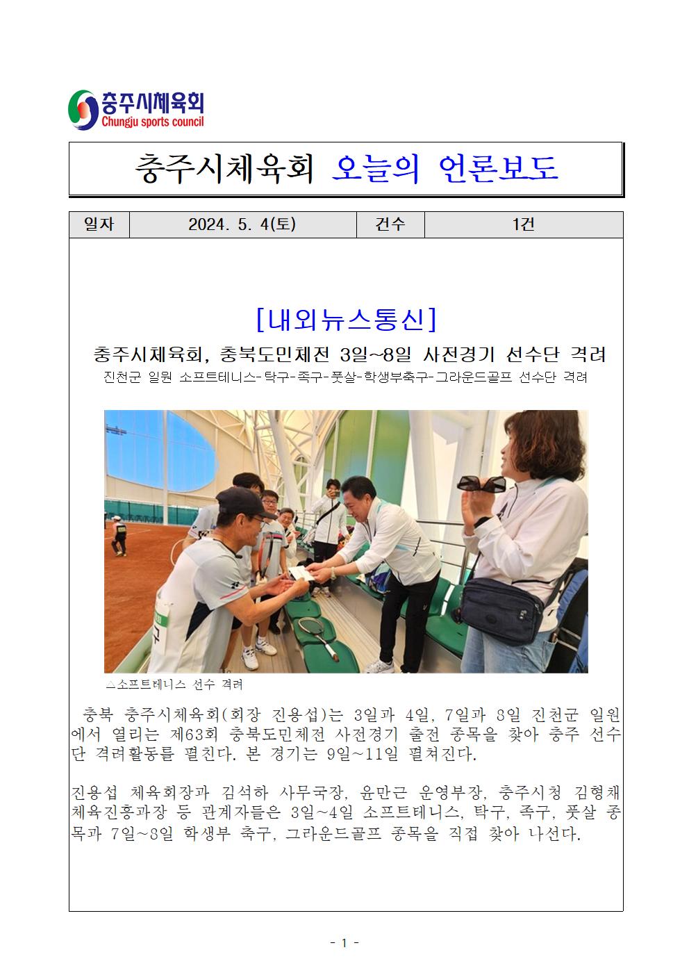 [제63회 충북도민체전 격려] -기간 : 2024. 5. 3(금)~4(토) -장소 : 진천군 일원 -내용 : 충북도민체전 사전경기 격려활동(충주시체육회) (언론보도) -내외뉴스통신 |
