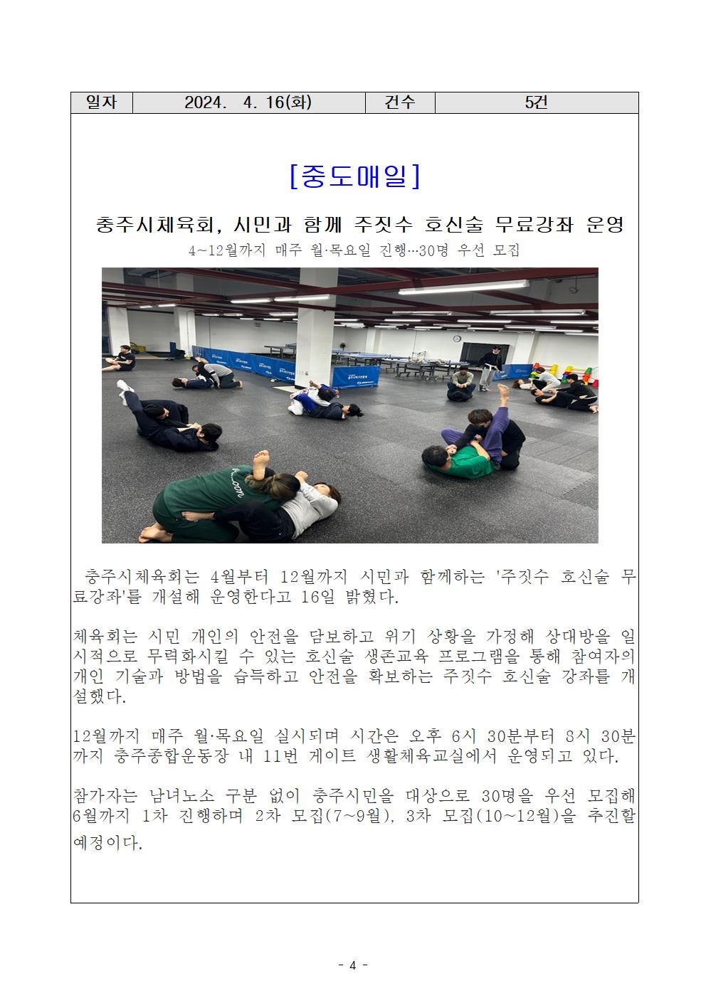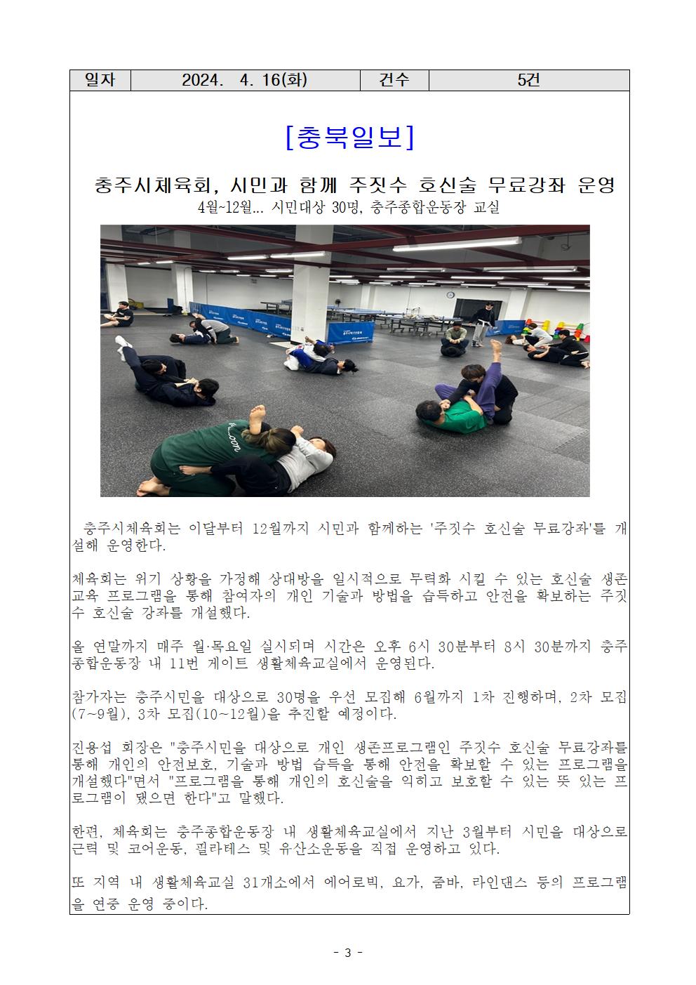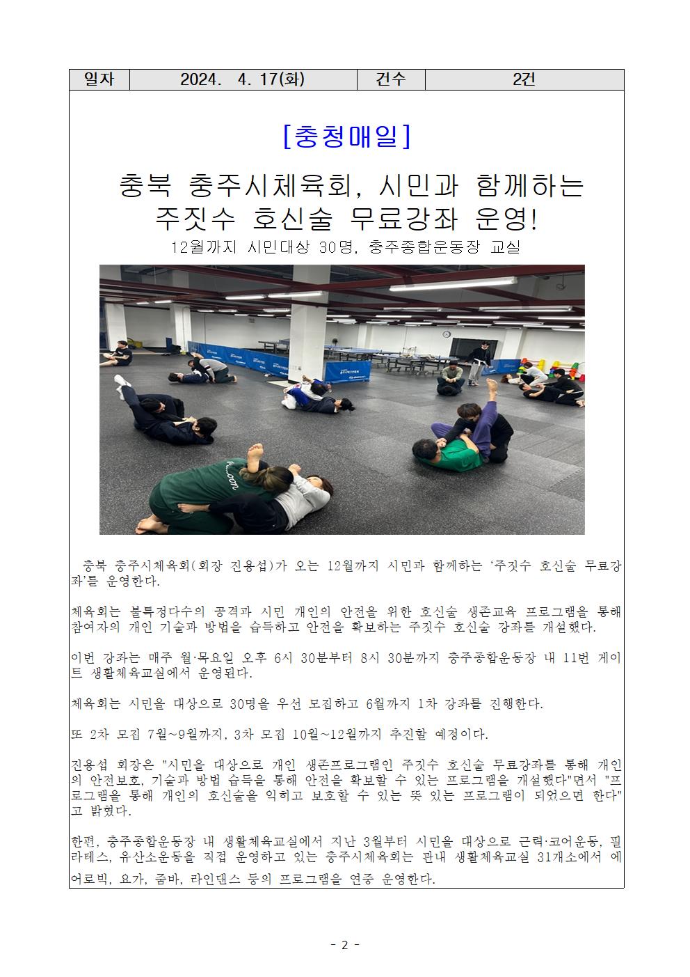 [충주시민을 위한 주짓수 호신술 무료강좌] -기간 : 2024. 4월~12월(3개월단위 운영) -인원 : 30명 (선착순 모집) -장소 : 충주종합운동장 내 교실 -주관 : 충주시체육회(회장 진용섭) |