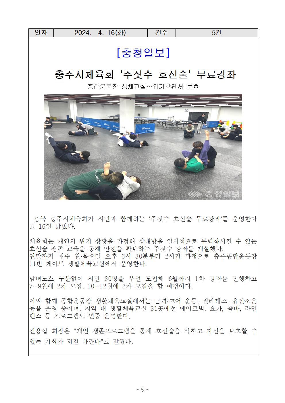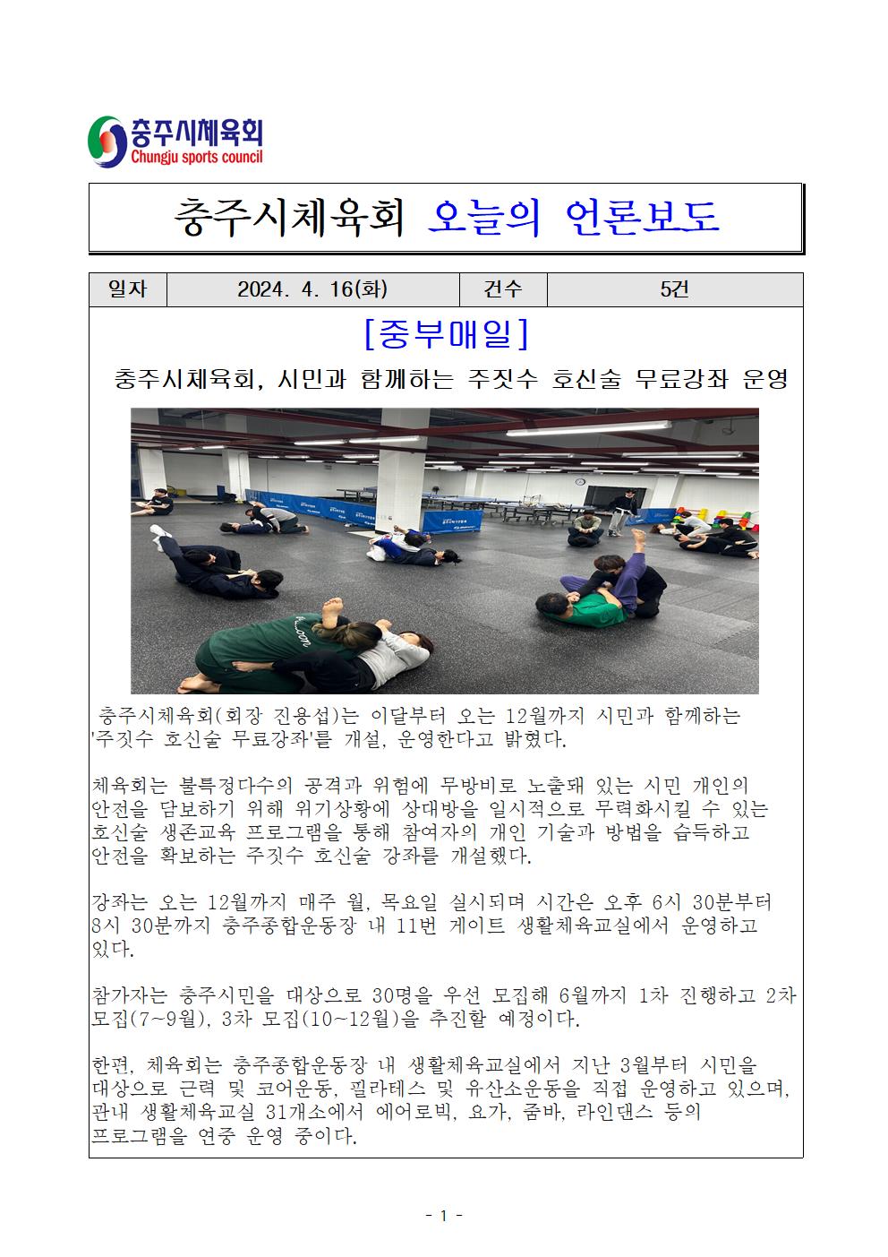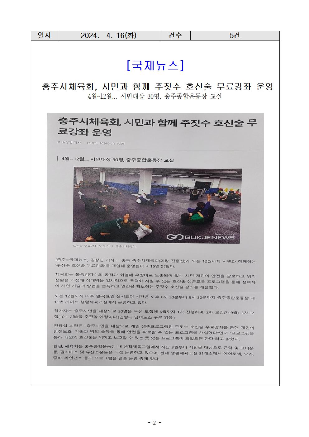 [충주시민을 위한 주짓수 호신술 무료강좌] -기간 : 2024. 4월~12월(3개월단위 운영) -인원 : 30명 (선착순 모집) -장소 : 충주종합운동장 내 교실 -주관 : 충주시체육회(회장 진용섭) |