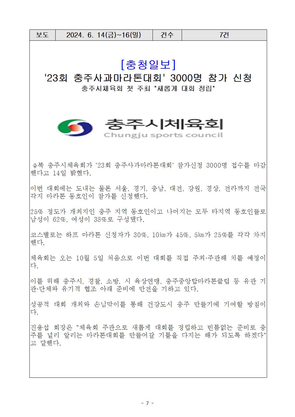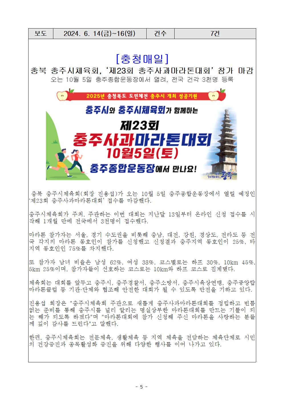 언론보도(제23회 충주사과마라톤대회 마감, 24. 6. 14일)(충청매일).jpg