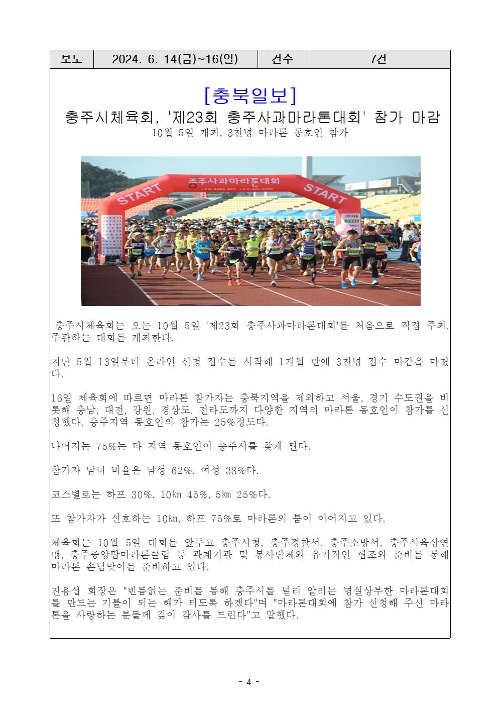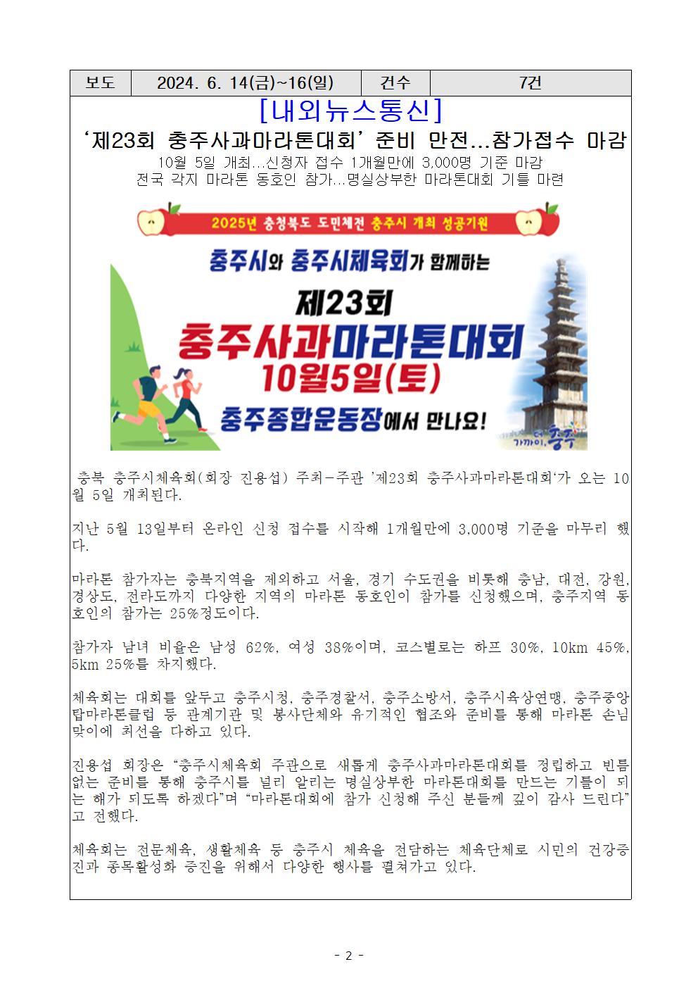언론보도(제23회 충주사과마라톤대회 마감, 24. 6. 14일)(충북일보).jpg