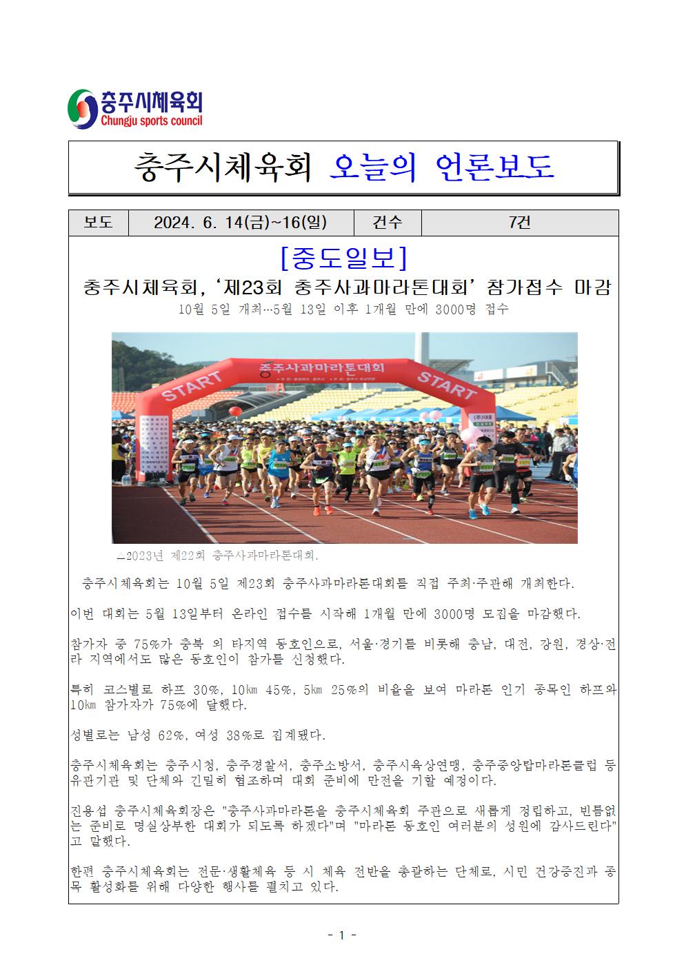 언론보도(제23회 충주사과마라톤대회 마감, 24. 6. 14일)(중도일보).jpg