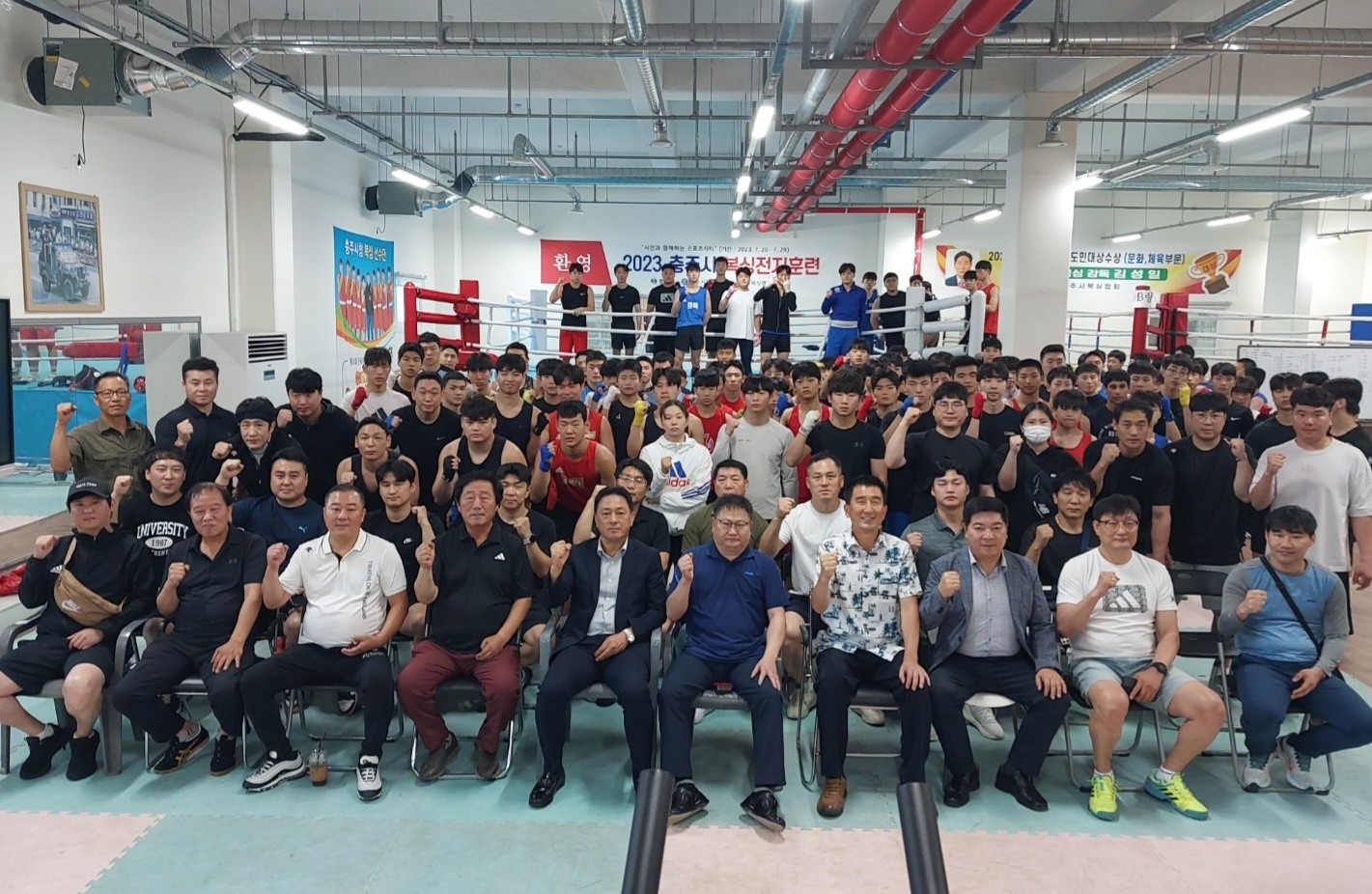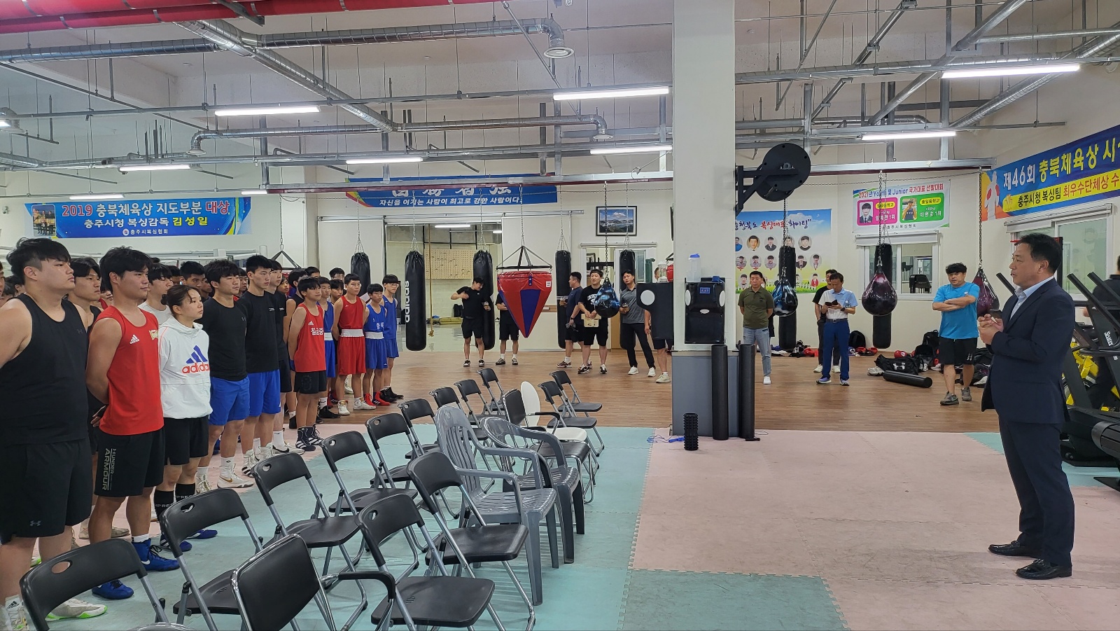 [2023 충주시 복싱 전지훈련] -기간 : 2023. 7. 20(목)~7. 29(토) -장소 : 충주종합운동장 복싱장, 충주공고 복싱장 -인원 : 중등부, 고등부, 대학부, 실업팀 240여 명 -내용 : 체력강화, 스파링 등 전지훈련 -주최 : 충주시체육회, 충주시 복싱협회 -주관 : 충주시 복싱협회(회장 임종률) -후원 : 충주시 -전지훈련 선수 격려 및 단체사진-