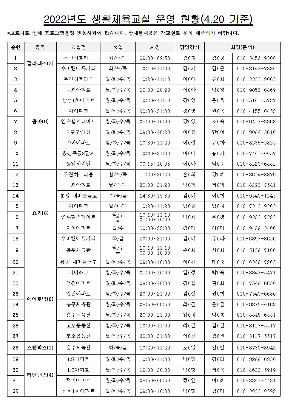 | 2022 생활체육교실 운영 현황 | |